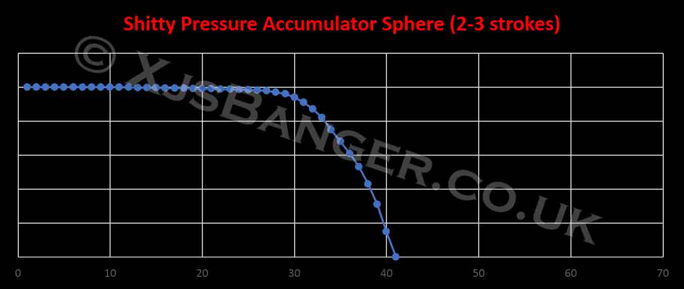 Now, overall time minus time without compression would be too easy as the brake liquid flows faster without pressure from membrane and goes slower while the pressure increases, so the ultimate factor will be somewhere close to 0.7, so time running without pressure = 1 while the time pump slows down due to increasing pressure = 0.7 to make it flat and easy in terms of volume. So we need to find time were compression starts evidently and apply 1.0 to pre-compression time and 0.7 to compression time Then we can count reference of top-up time as the jump from 140bar to 18bar and calibrate our calculation. Then we can divide time while running with no compression by the overall time of pump action to get our theoretical percentage of Pressure Accumulator Sphere’s performance loss. Plus measurement uncertainty of 10%. I know, it sounds simple. To simplify even more we need to apply likelihood of issue occurrence for three main components of XJS brake accumulator...